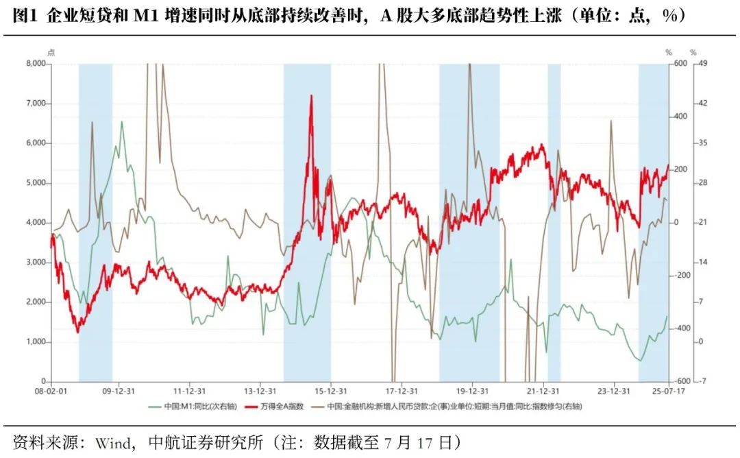 从经济数据的边际变化来看,6月份经济结构表现分化,抢出口效应较为显著,并带动工业产出明显恢复,但消费和投资有所回落。6月份金融数据在总量和结构上均有所改善,其中企业短贷同比大幅多增、M1增速持续提升,反应实体经济短期活跃度高。观察自2008年以来,企业短贷增速和M1增速同时从底部趋势性改善对投资者信心有较强的提振作用,万得全A大多从底部趋势性上涨。