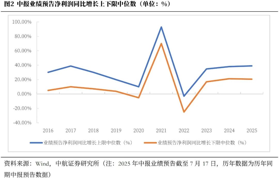 上市企业2025年中报业绩预告盈利增速中位数小幅上行,预计2025年上半年A股盈利增速水平与去年同期基本持平,自2022年大幅回升后近年来呈现稳中有升态势。从披露率来看,截至2025年7月17日,A股中报预告1533家,披露率达28.29%,较2024年7月17日披露率29.84%基本持平。总体来看,业绩预喜(预增、略增、续盈、扭亏)的企业共671家,占比43.77%,相较去年预喜占比43.65%略升;预警(预减、略减、续亏、首亏)企业共858家,占比55.97%,相较去年预警占比56.10%略降,但整体变化不大。截至7月17日,2025中报净利润同比增长率上限、下限中位数分别为38.89%和20.36%,相较去年同期看,2025中报净利润同比增长率上限较2024中报上限中位数上升0.96pct,2025中报净利润同比增长率下限较2024中报下限中位数下滑0.74pct。从近十年历史水平看,2025中报净利润同比增长率上限、下限中位数分别位于近十年来中报业绩预告净利润同比增长上下限中位数的88.88%和77.77%,处于近十年较高水平。