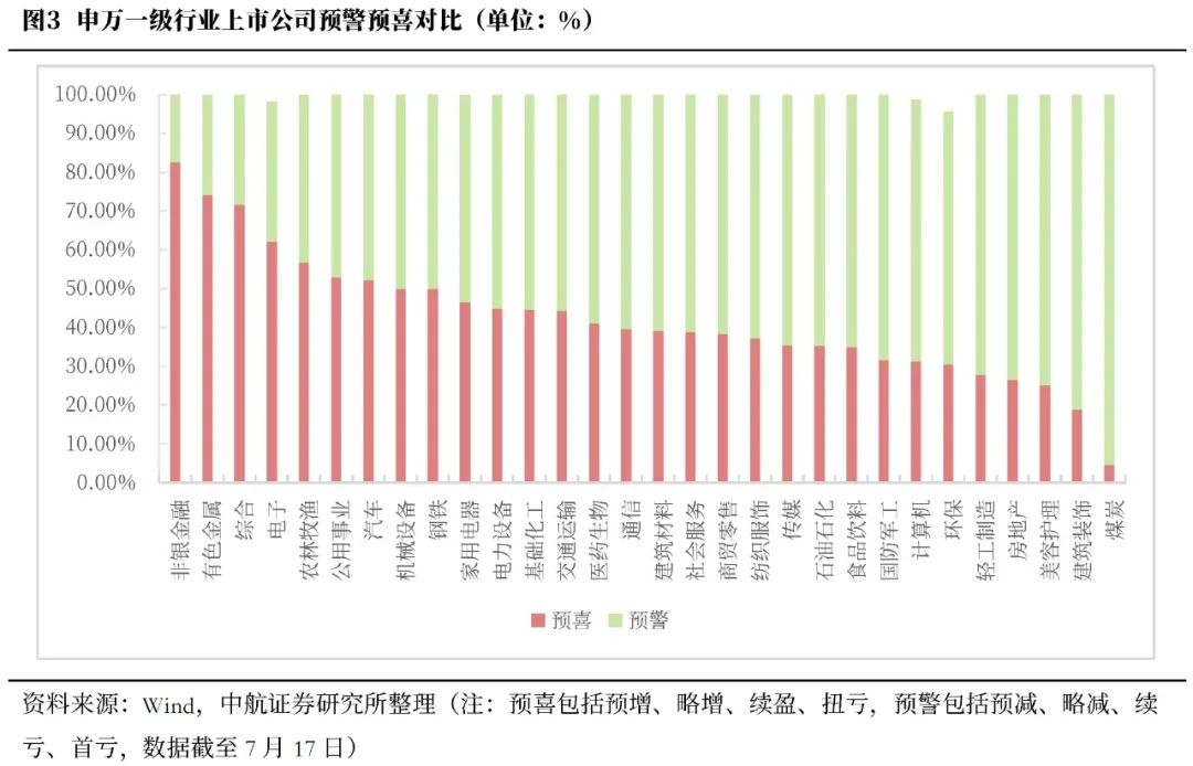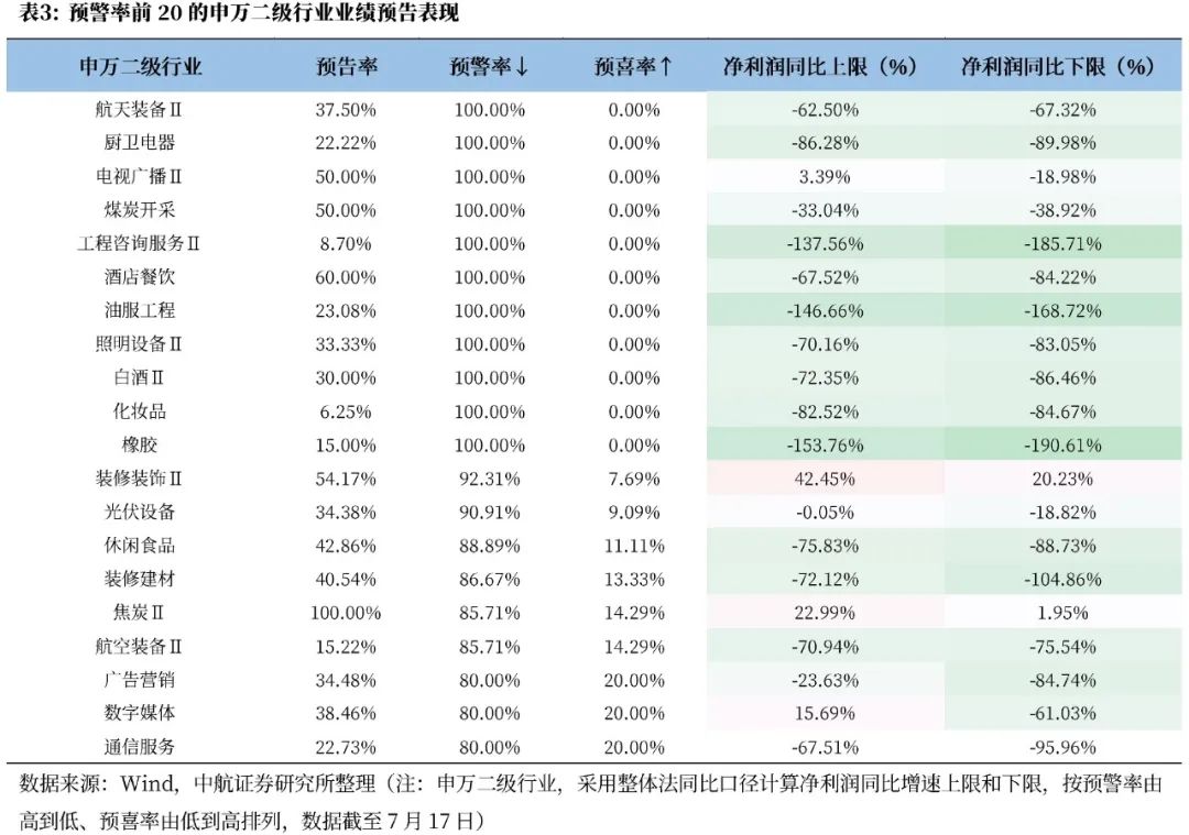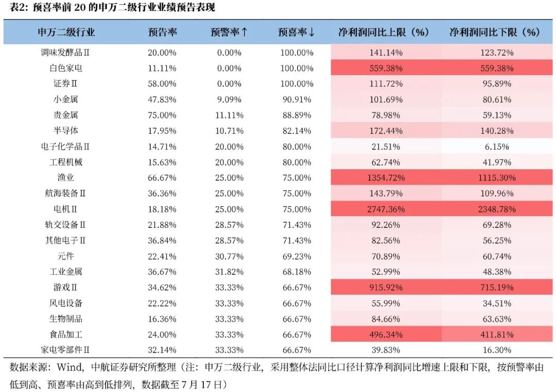 分行业看,申万一级行业中,非银金融、有色金属、综合、电子、农林牧渔等行业预喜占比较高,达82.50%、74.07%、71.43%、62.04%、56.60%;煤炭、建筑装饰、美容护理、房地产、轻工制造等行业预警占比较高,达95.45%、81.25%、75.00%、73.61%、72.22%。进一步观察申万二级行业业绩预告按照预喜率和预警率的前20个行业。其中,预喜率前20个行业中,净利润同比上下限远超市场中位数的行业为电机Ⅱ、渔业、游戏Ⅱ、白色家电、食品加工等;预警率前20个行业中,净利润同比上下限远低市场中位数的行业为橡胶、油服工程、工程咨询服务Ⅱ、厨卫电器、化妆品等。