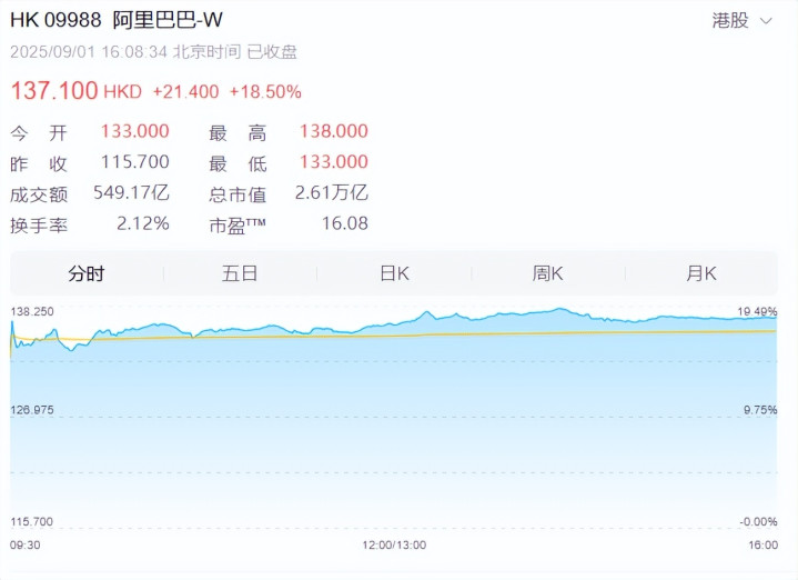 9月1日,继美股大涨近13%后,阿里巴巴港股开盘再度暴涨,盘中一度涨近19%,有望创下2022年3月以来单日涨幅新高。